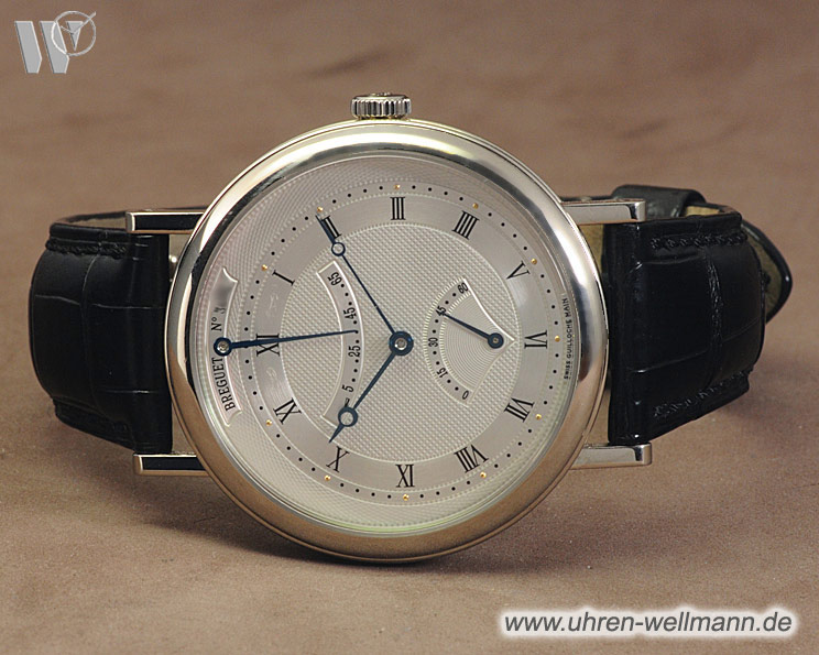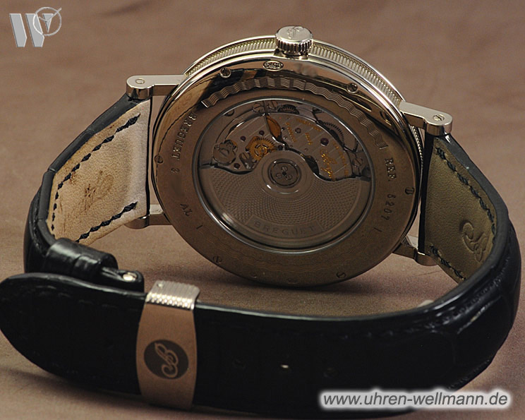 Das Gehäuse aus edlem Weißgold verleiht der Uhr eine dezente, luxuriöse Ausstrahlung. Die fein gearbeiteten Bandanstöße und die geriffelte Gehäuseflanke sind typische Merkmale der Marke Breguet. Die ausgewogenen Abmessungen sorgen für einen angenehmen Tragekomfort und machen die Uhr vielseitig tragbar.