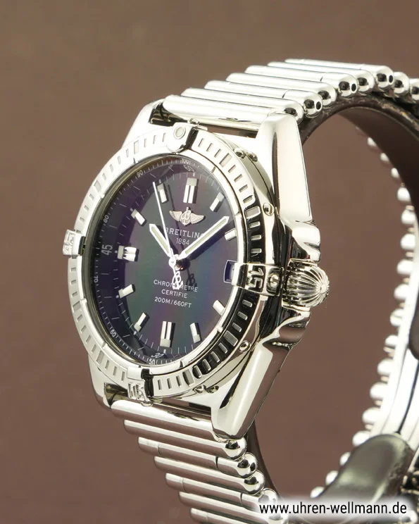 Die Uhr kommt mit Originalbox und Papieren aus dem Jahr 2002. Zustand: sehr gut! Das Rouleaux-Gliederband aus Edelstahl trägt sich angenehm am Handgelenk und ist typisch für die klassische Breitling-Damenkollektion dieser Generation.
