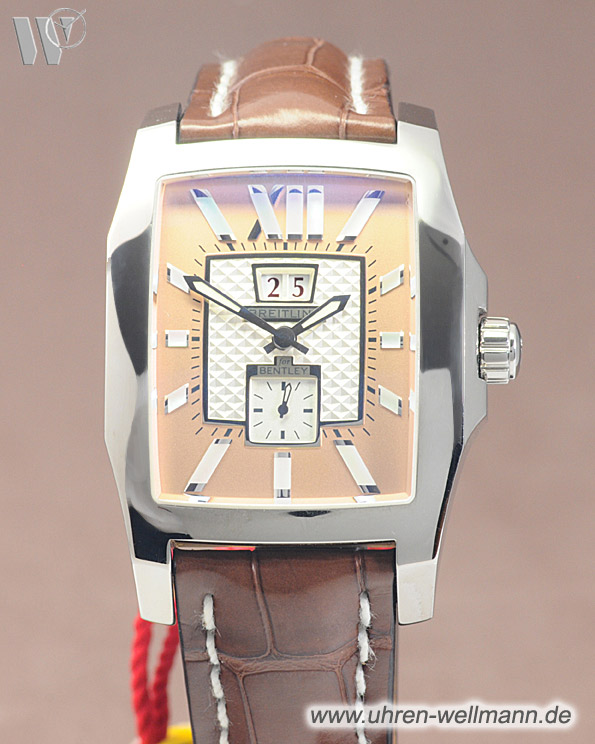Die Breitling for Bentley Flying B No. 3 Ref. A16362 ist eine seltene, ungetragene Herrenuhr aus Stahl mit charakteristischem rechteckigen Gehäuse, Automatikwerk Kaliber 16B und Chronometerzertifikat. Mit kupferfarbenem Zifferblatt, entspiegeltem Saphirglas, Lederarmband und vollständigem Lieferumfang (Box & Papiere) bietet sie höchste Schweizer Uhrmacherkunst und ein markantes, elegantes Design.