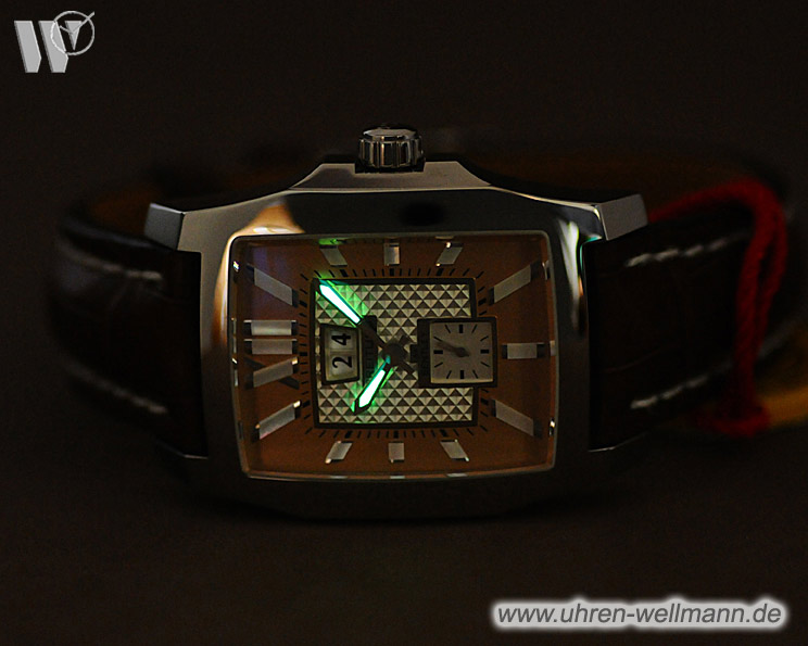 Ein hochwertiges Lederarmband mit Stiftschließe rundet das elegante Gesamtbild ab und trägt sich komfortabel am Handgelenk.