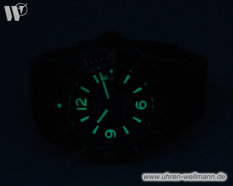 Das tiefblaue Zifferblatt bildet einen eindrucksvollen Kontrast zum schwarz beschichteten Gehäuse. Große Indizes und Zeiger mit Leuchtbeschichtung gewährleisten eine ausgezeichnete Ablesbarkeit – selbst bei schlechten Lichtverhältnissen oder in großer Tiefe. Die einseitig drehbare Lünette ermöglicht eine sichere Messung von Tauchzeiten.