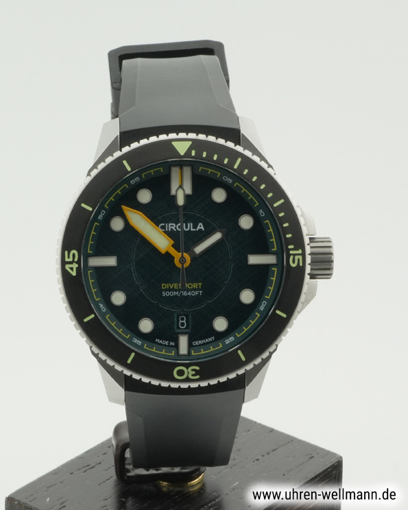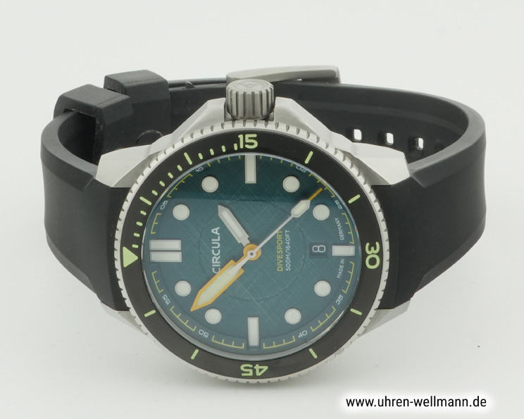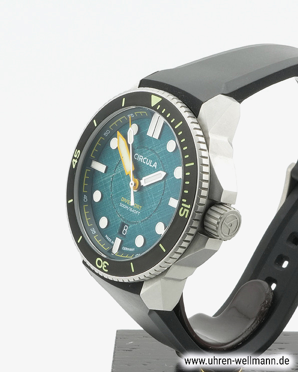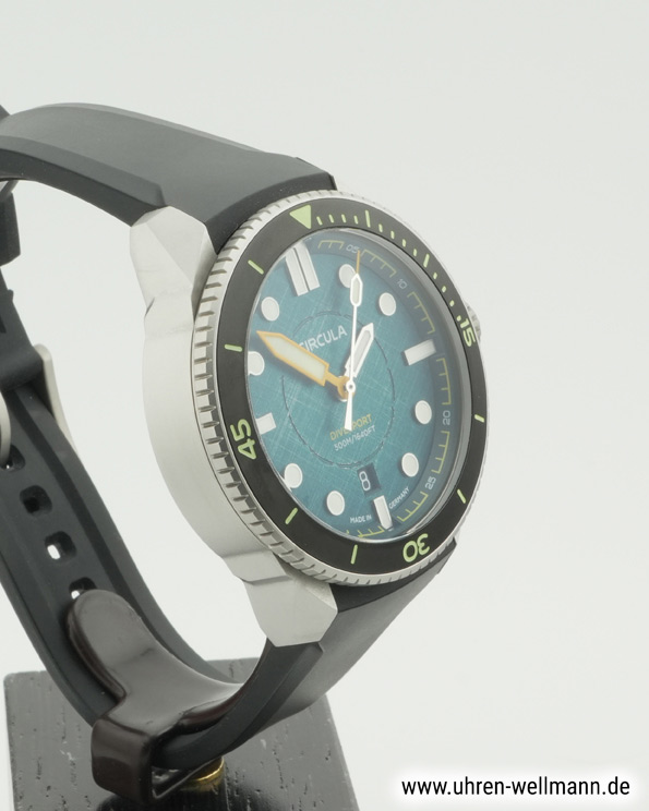 Die Circula DiveSport Titan Petrol ist eine robuste Taucheruhr aus leichtem Titan mit sportlich-elegantem Design. Hohe Widerstandsfähigkeit, zuverlässige Technik und eine exzellente Ablesbarkeit machen diese Uhr zu einem idealen Begleiter für Alltag, Sport und Wassereinsatz.