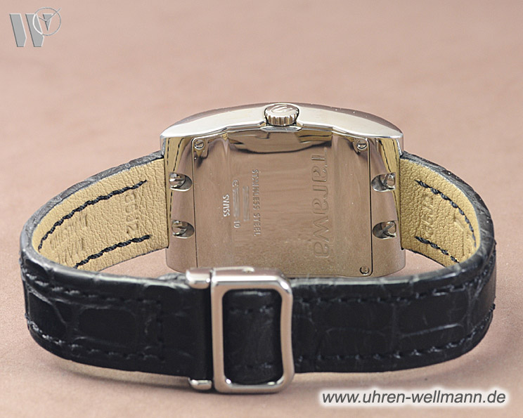 | Bemerkung | Stahlgehäuse mit Diamantlünette, Lederband und Faltschließe, Quarz, entspiegeltes Saphirglas, Perlmuttblatt mit 10 Diamanten, ab Werk 50m wasserdicht, Gehäusegröße: 28, 6 x 28, 2 mm (ohne Bandanstöße), Höhe: 7, 6 mm, Ref.: 96566J28, Box und Papiere – Ladys wristwatch, steelcase, diamondsbezel, with leatherstap and foldingclasp, motherofperldial with 10 diamonds, sapphireglass |