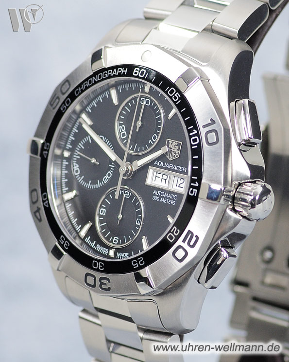 Die hochwertige Uhr mit einem Gehäuse aus Stahl und einem Armband aus Kautschuk wird mit einer Stiftschließe geschlossen und besitzt eine drehbare Lünette. Das schwarze Zifferblatt des TAG Heuer Chronographen wird von Saphirglas geschützt. Zudem besteht der Gehäuseboden der TAG Heuer Uhr aus verschraubtem Stahl. Der Gehäusedurchmesser beträgt ohne Bandanstöße und Krone 43 mm, die Gehäusehöhe wird mit 15,7 mm angegeben. Die Herrenuhr ist ab Werk bis zu 50 bar wasserdicht und besitzt eine verschraubte Krone sowie ein Heliumventil. Sie sind auf der Suche nach hochwertigen Uhren? Dann ist ein Modell von TAG Heuer ideal für Sie geeignet.